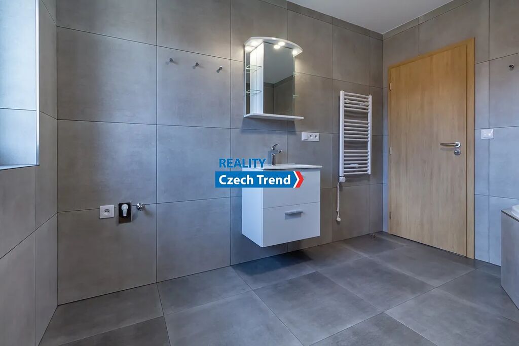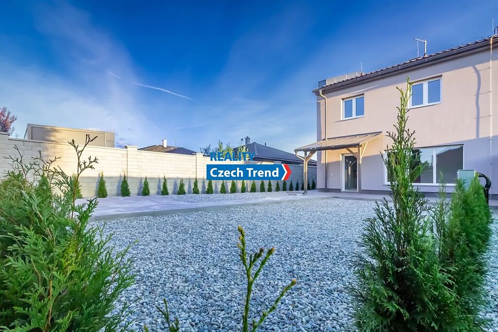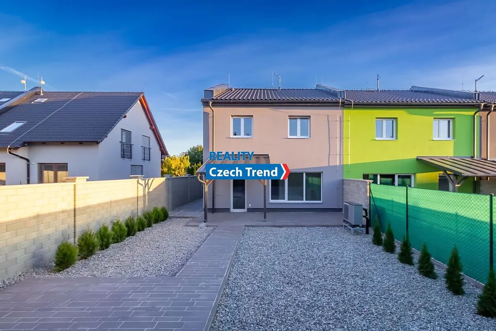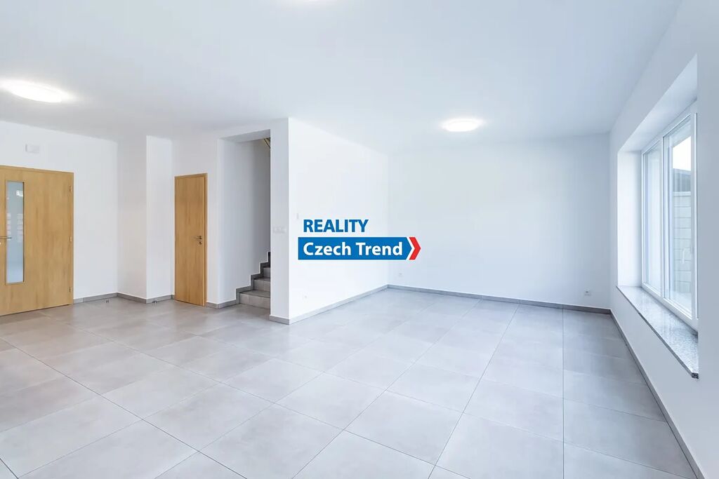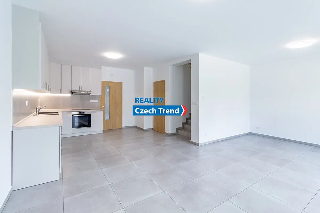 Poslední dva volné domy z osmi! Nabízíme Vám k pronájmu zcela nový moderní řadový rodinný dům 4+kk s garáží a venkovním parkovacím stáním pro jedno až dvě auta v rámci developerského projektu v obci Bystročice nedaleko Olomouce. Velmi nízké nájemné je nižší, než nájemné srovnatelně velkého bytu s garáží v Olomouci. Měsíční zálohy na elektřinu vč. topení jsou cca 4.000,- Kč, na vodu cca 1.000,- Kč. Celková velikost pozemku k domu je včetně zastavěné plochy 234 m². Dům je postaven z cihel Porotherm, okna trojskla zn. Schüco, značkové armatury Hansgrohe. V přízemí domu je vstupní chodba, koupelna se sprchovým koutem, umyvadlem, toaletou a přípojkou na pračku, technická místnost s tepelným čerpadlem o výkonu 8 kW, značky Nibe F 2040-8 + VVM 225 s bojlerem o obsahu 180 l, kuchyňský kout s kuchyňskou linkou s vestavnými nerezovými spotřebiči a přípravou na myčku, obývací pokoj s francouzským oknem a vstupem na částečně zastřešenou terasu a bezúdržbovou zahradu, schodiště do patra. V patře domu jsou tři ložnice, šatna a koupelna s vanou, umyvadlem, toaletou, bidetem a přípojkou na pračku. V celém domě včetně garáže je na podlaze dlažba s teplovodním podlahovým vytápěním. Dům je připojen na optický kabel, rozvody internetu a TV signálu jsou v každém pokoji.