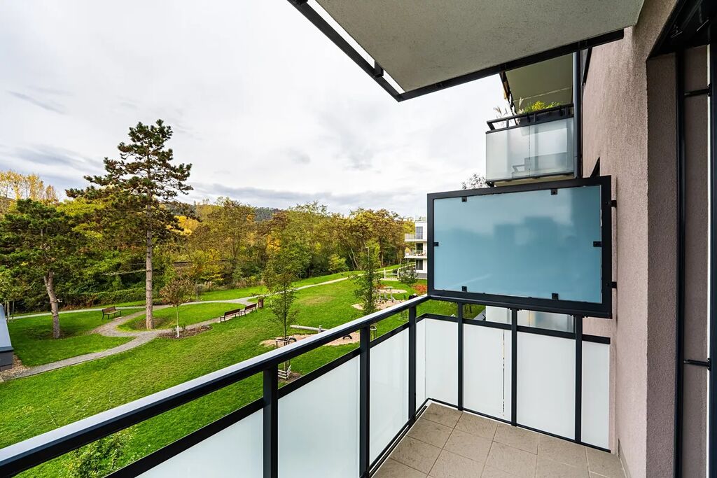 No a pak je tu balkon. 4,2 m² směrem na západ. To je přesně ta světová strana, která neobtěžuje ráno, ale večer vám dá to nejlepší. Západ slunce v korunách stromů, za kterými se skrývá golfové hřiště i řeka Vltava. Ideální na ranní espresso, večerní skleničku… nebo prostě na chvilku ticha, kdy vypnete hlavu a zapomenete na svět.
