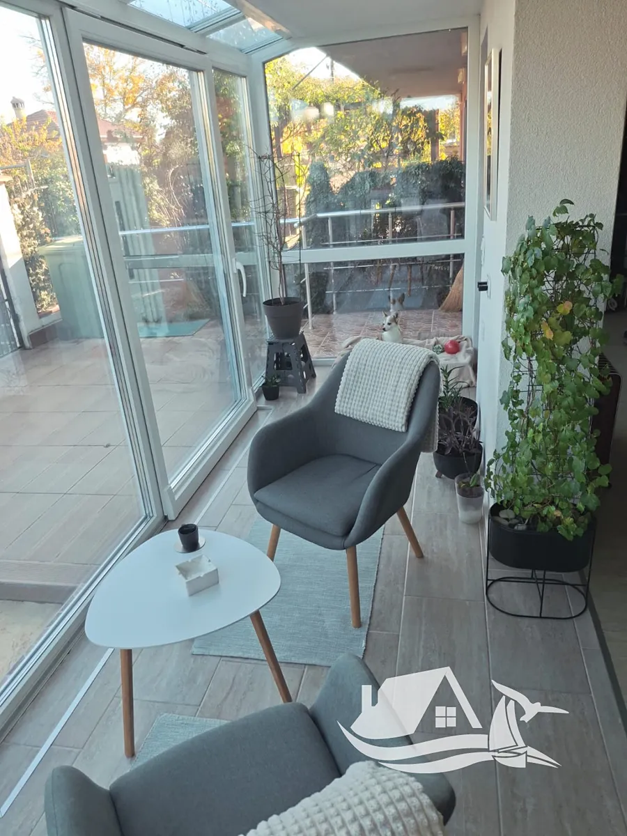 Dům o obytné ploše 114 m² je zapsán v katastru jako samostatná jednotka s vlastním dvorem o rozloze 270 m². Dispozice je prakticky řešena – světlý obývací pokoj s kuchyní plynule navazuje na prosklenou krytou terasu, která slouží jako další obytný prostor s podlahovým vytápěním. Dvě ložnice poskytují dostatek soukromí, dvě moderní koupelny doplňují vysoký standard bydlení.