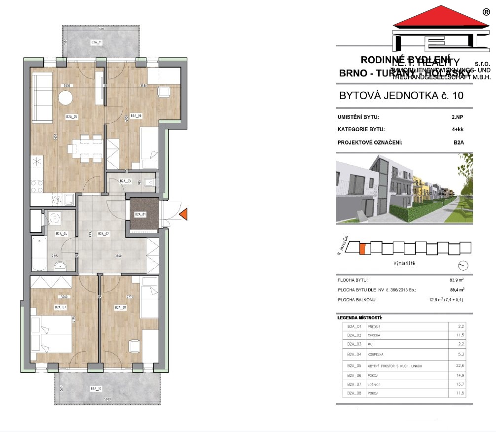 Prodej novostavby vilabytu č. 10, 4+kk, 89,4 m², se dvěma balkony 7,4 m² a 5,4 m², na něž je vstup možný ze všech pokojů. Jednotka je situovananá ve 2.NP čtyřpodlažního domu a její součástí je také sklep 4,9 m2.