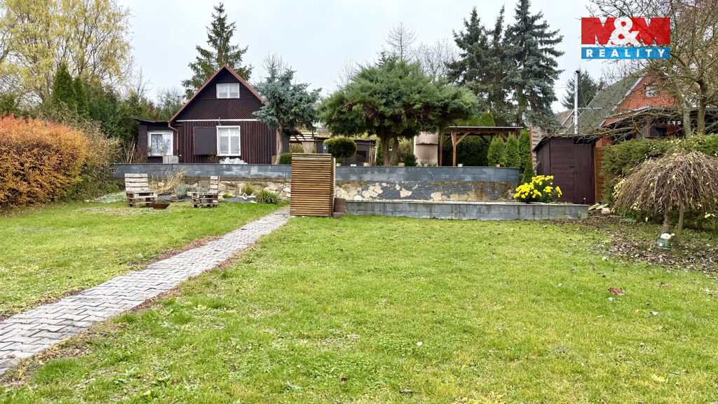 Chata s přivedenou elektřinou a elektrickými kamny má ve spodní části kuchyňskou linku a horní část určenou ke spaní. Součástí pozemku je nově zrekonstruovaná pergola v těsné blízkosti krbu, který je propojený udírnou. V horní části zahrady je menší sklep a 2 dřevěné kůlny na uložení nářadí, které zůstává, včetně sekačky a elektrických nůžek na keře. Díky vrtu s čerpadlem je možné na připravených místech postavit bazén i vířivku. V horkých dnech oceníte sprchový kout uprostřed zahrady. Pitnou vodu lze přinést ze společného vodovodu na čip v docházkové blízkosti. Parkování je možné na pozemku.
