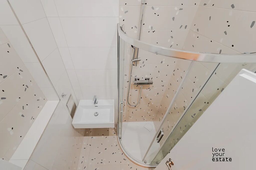 Byt sestává z předsíně s vestavěnými skříněmi, obývacího pokoje s kuchyní (lednice s mrazákem, trouba, myčka a varná deska), ložnice se šatnou, koupelna s sprchovým koutem, wc samostatné.