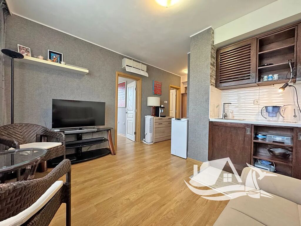 Tento elegantní apartmán 2+kk o ploše 53 m² se nachází v posledním šestém podlaží moderního komplexu Messembria Resort, jen pět minut chůze od pláže Cacao Beach – jedné z nejznámějších a nejkrásnějších částí Slunečného pobřeží.