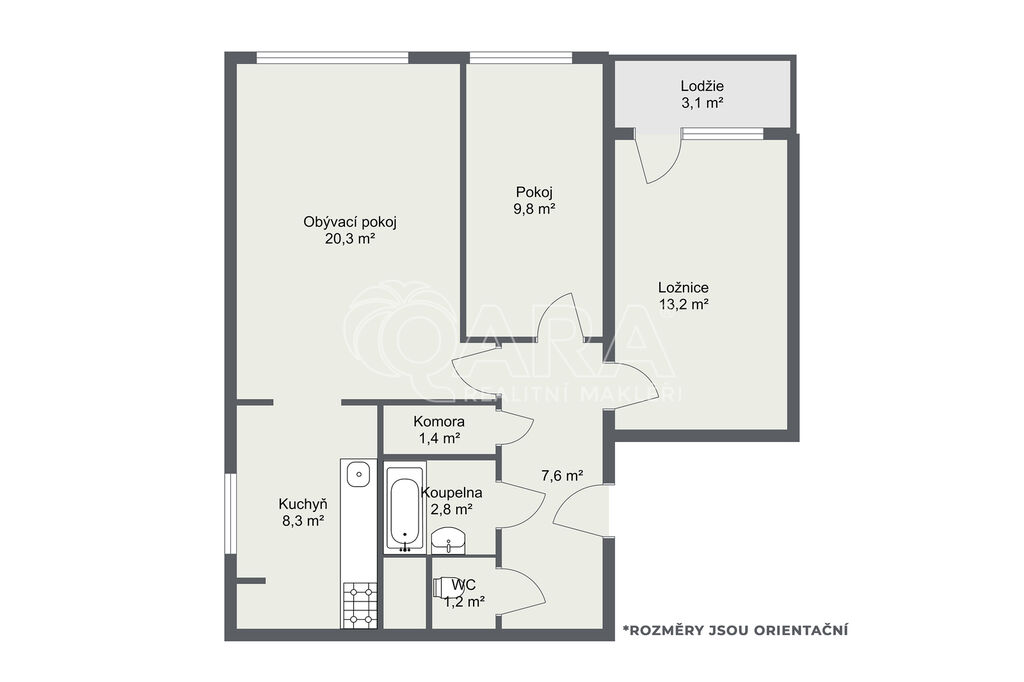 Dispozice bytu je velmi praktická – tři neprůchozí pokoje z nichž na jeden navazuje kuchyně, dále pak koupelna, samostatné WC, předsíň, komora a lodžie přístupná z jednoho z pokojů. Orientace na jihozápad zaručuje dostatek denního světla po celý den. Okna jsou plastová, ale jinak je byt v původním stavu a je určen ke kompletní rekonstrukci. Jádro je umakartové. Díky tomu si můžete byt upravit přesně podle svých požadavků a vkusu.