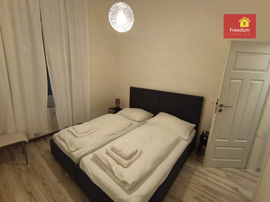 Prostorný vybavený byt v prvním podlaží vily, osobní vlastnictví. Obývací pokoj je spojen s kuchyn, ložnice a šatna, k dispozici je koupelna se sprchovým koutem a WC. Byt je zařízený.