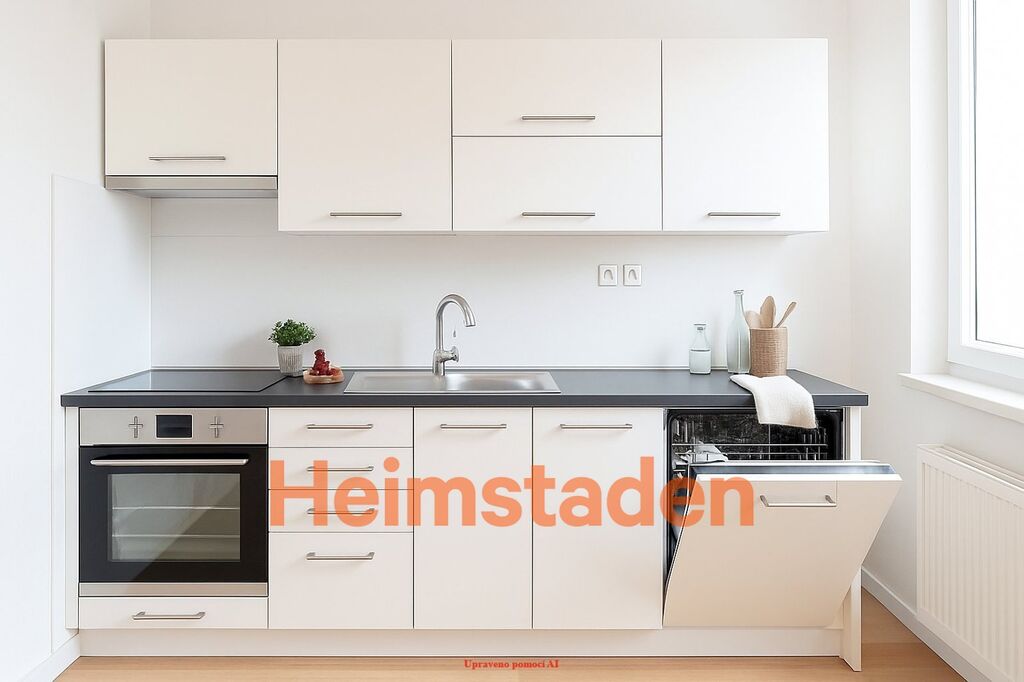 V bytě bude nová kuchyňská linka s vestavěnou myčkou, troubou a elektrickou varnou deskou.