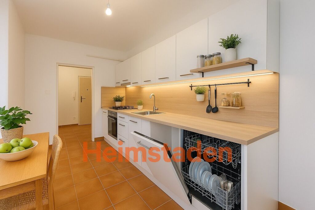Součástí bytu je nová kuchyňská linka s vestavěnými spotřebiči včetně elektrické trouby, varné desky a digestoře. Koupelna je vybavena sprchovým koutem a je spojena s toaletou. V celém bytě jsou nové podlahy, plastová okna a čerstvá výmalba.