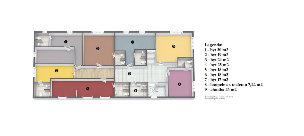 Podkroví: chodba, 7 ubytovacích jednotek, koupelna s wc a schody na půdu.