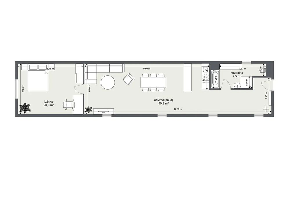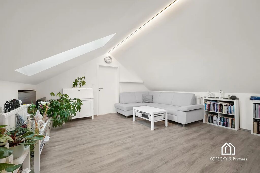 Hlavní obytný prostor působí světlým a příjemným dojmem, o což se starají nová střešní okna s trojskly, zajišťující kvalitní tepelnou i akustickou izolaci. Dispozice je řešena tak, aby nabídla dostatek komfortu i funkčnosti – od obývací části přes kuchyňskou zónu až po možnost vytvoření pracovního místa. Samostatná ložnice je situovaná tak, aby poskytovala soukromí a klid. Koupelna je moderní, čistá a prakticky řešená.