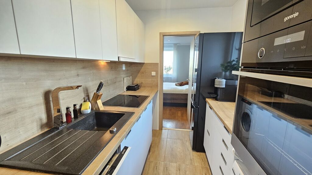 Nabízíme k prodeji mimořádně zdařile navržený byt 2+1 o výměře 55 m² v osobním vlastnictví v ulici Hrusická. Bytová jednotka je umístěna ve 3. patře modernizovaného, kompletně zatepleného panelového domu z roku 2024 s novým výtahem a přípravou pro venkovní žaluzie. Dům i samotná jednotka splňují vysoké nároky na současné bydlení, a to jak po technické, tak estetické stránce. Byt prošel v roce 2018 perfektní, koncepční a do detailu promyšlenou rekonstrukcí podle představ paní majitelky, při které kladla důraz na maximální efektivitu prostoru, dostatek úložných míst a praktické využití každého centimetru. Nejde o běžnou rekonstrukci – toto je byt, kde vše navazuje, dává smysl a působí esteticky i funkčně. O Obývacím pokoji se dá s nadsázkou říci že je multifunkční srdce domácnosti. Dominantou pokoje je kvalitně řešená sklápěcí postel integrovaná v nábytkové stěně, která umožňuje okamžitou proměnu obývací zóny v plnohodnotnou ložnici. Alternativou je pohodlný rozkládací gauč. Pod televizí se nachází další chytře skrytá úložná místa. Celý prostor působí harmonicky, vzdušně a nabízí vysokou variabilitu. Vedle pokoje se nachází designová kuchyň s maximálním vybavením. Kuchyňská linka je naprosto nadstandardní – komínová stěna s vestavnou troubou a mikrovlnkou, myčka na nádobí, pračka, sušička, promyšlené rozvržení skříněk a důmyslné členění úložných prostor. Kuchyň je navržena tak, aby byla nejen krásná, ale především extrémně praktická pro každodenní život. Koupelna působí moderním, čistým dojmem. Nabízí sprchový kout, elegantní umyvadlo a podsvícené designové zrcadlo. Toaleta je samostatná, což ještě zvyšuje komfort. Druhá obytná místnost slouží v současnosti jako dětský pokoj. Díky své dispozici nabízí příjemné světlo a dostatek prostoru pro postel, úložné části i pracovní koutek. Další přednosti bytu - okna na tři světové strany, tímto je byt po celý den nádherně prosvětlený, velká vestavěná skříň v chodbě. Tento byt vás okouzlí elegantními detaily, kvalitními materiály a nadčasovým řešením. K dispozici je v suterénu domu sklepní prostor.