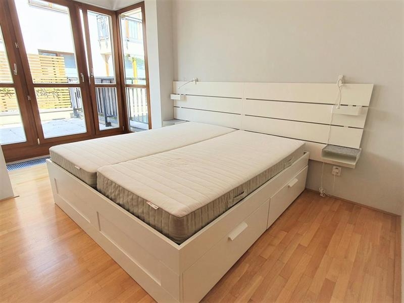 Orientace bytu a terasy je převážně na slunný západ a jih (pouze 1 menší pokoj je na sever). Vstup na prostornou terasu je možný jak z obývacího pokoje tak i ložnice. Byt má 2 neprůchozí pokoje. Je zařízený nábytkem včetně kuchyňské linky se žulovou pracovní deskou a sklokeramickou varnou deskou, el. troubou, lednicí s mrazákem, myčkou a mikrovlnnou troubou. Dále je k dispozici pračka, nábytek viz foto včetně 2 vestavěných šatních skříní. V obývacím pokoji je k dispozici funkční krb na dřevo. Okna v každém pokoji mají elektricky ovládané venkovní rolety. V koupelně je sprchový kout a umývadlo. WC s menším umývadlem je zvlášť. Na podlaze jsou parkety a dlažba. Topení je ÚT - dům má vlastní kotelnu. V koupelně, na WC a nachodbě je možné využívat navíc podlahové vytápění. Parkování je zajištěno v garážovém stání v 1.PP domu.