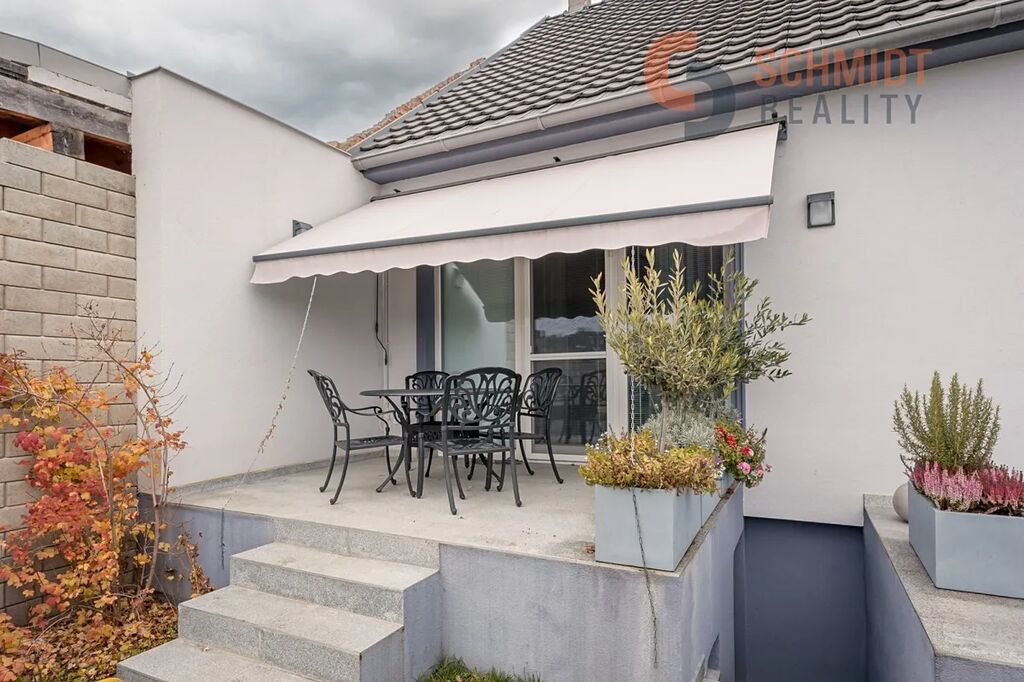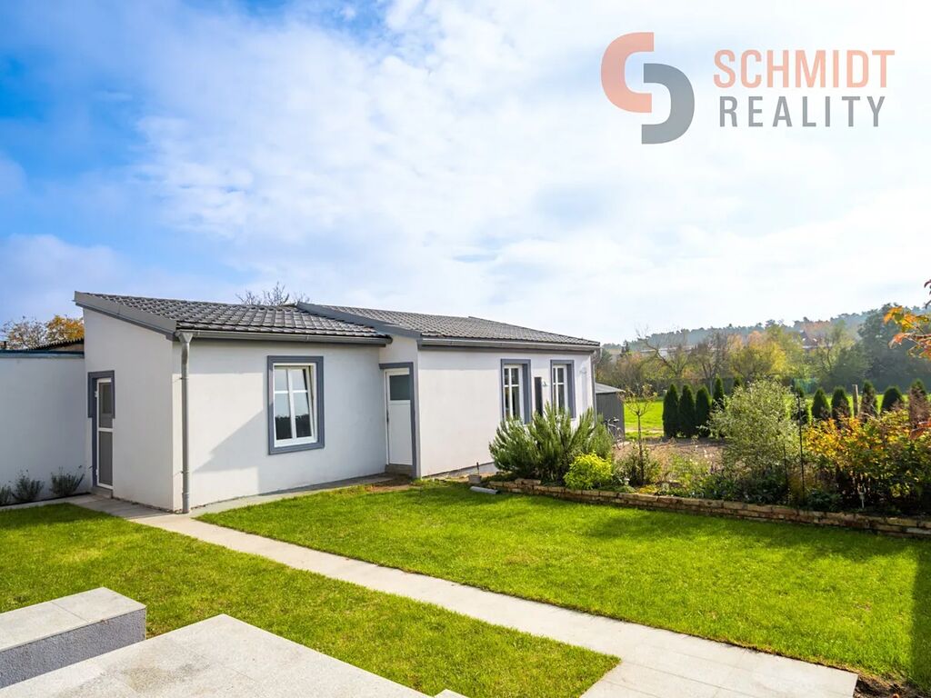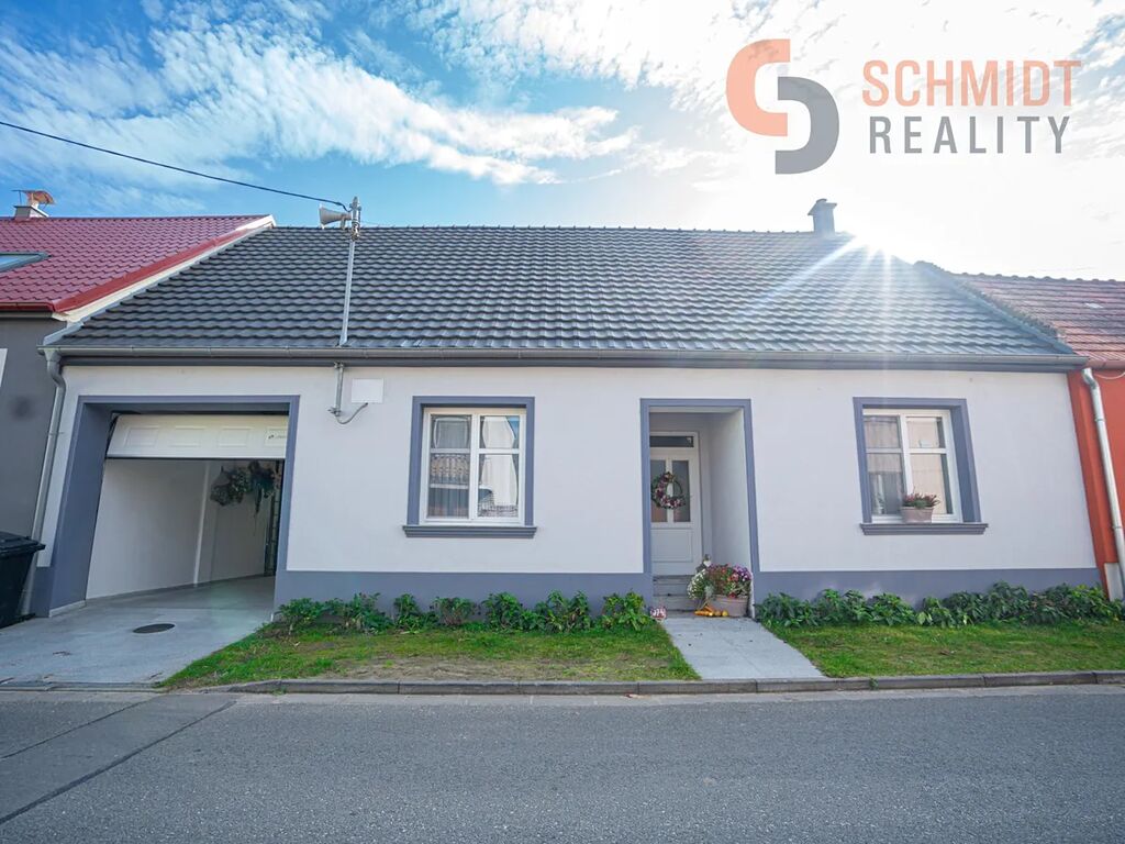 Dispozice domu je praktická a pohodlná: dvě ložnice, kuchyně, koupelna, dvě samostatné toalety, prostorná garáž a terasa s přímým vstupem na zahradu.
