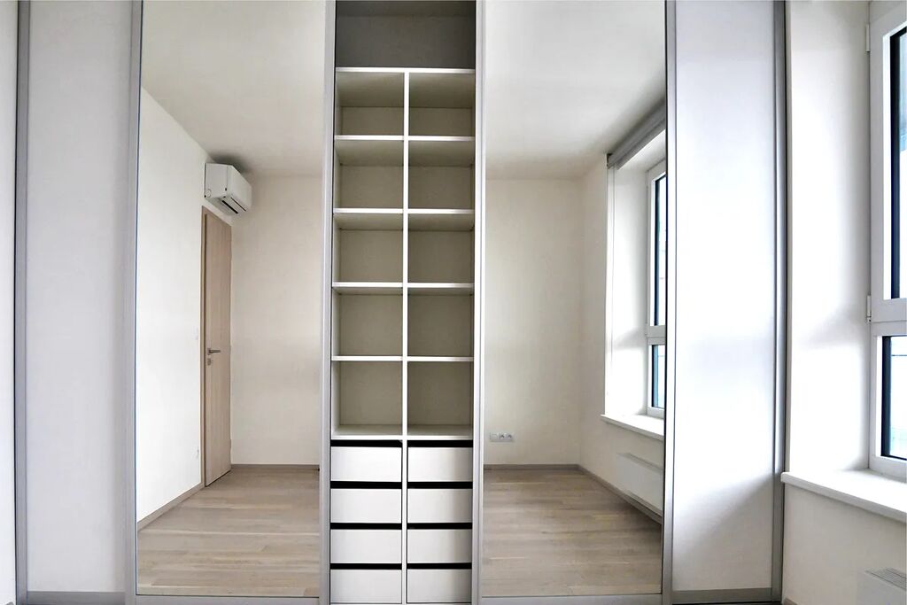 - V ložnici je na míru zhotovená vestavěná skřín s efektivně vymyšleným vnitřním řešením s posuvnými dveřmi