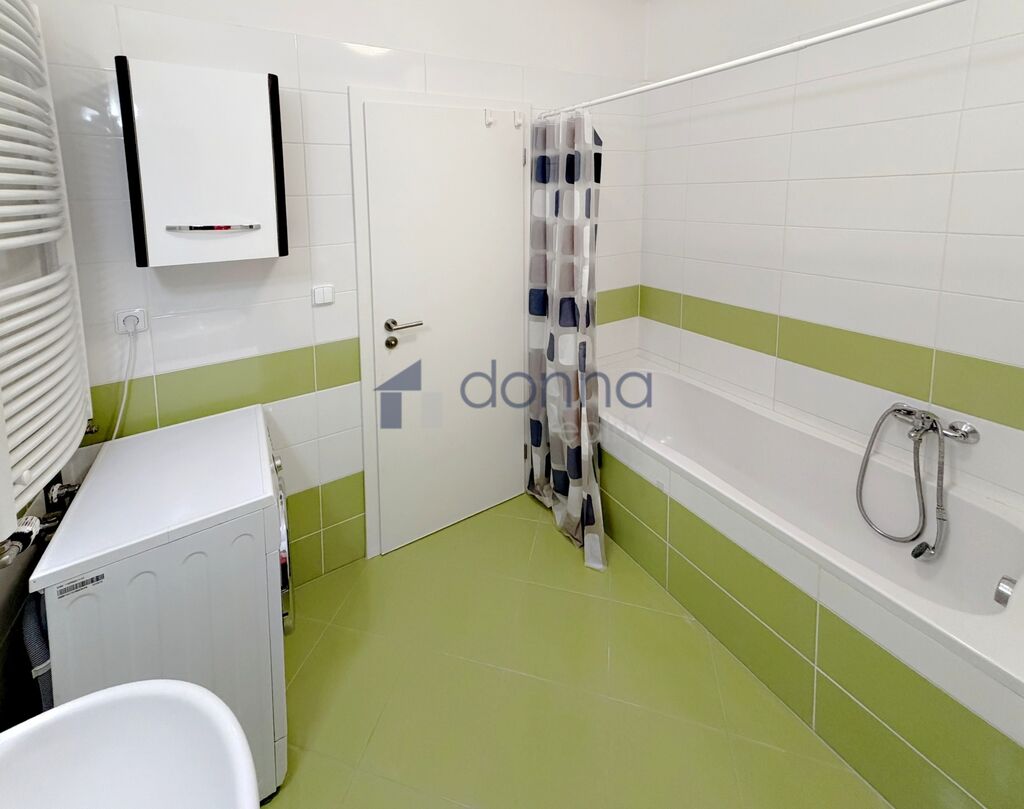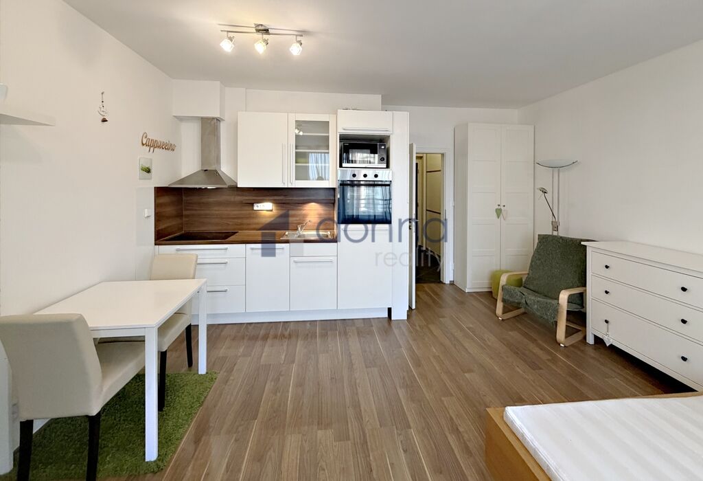 Vybavení: kuchyňská linka se spotřebiči (varná deska, pečící trouba, myčka nádobí, lednice, mikrovln. trouba, odsavač par, nádobí), lůžko včetně matrace, komoda, police, jídelní stůl + 2 židle, skříňka na TV a úložné prostory ve vysokých skříních.
