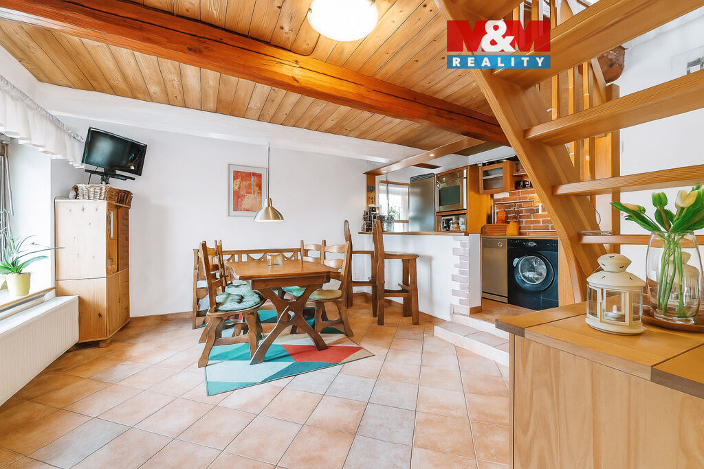 V přízemí najdete tři pokoje, kuchyň s jídelnou, koupelnu s toaletou a chodbičku. Do patra vede stylové dřevěné schodiště, kde se nachází další pokoj, koupelna se sprchovým koutem, druhá toaleta a otevřený prostor ideální pro pracovnu, relaxační zónu nebo hernu pro děti. K dispozici je také garáž a jižně orientovaná terasa, která zve k odpočinku na slunci.