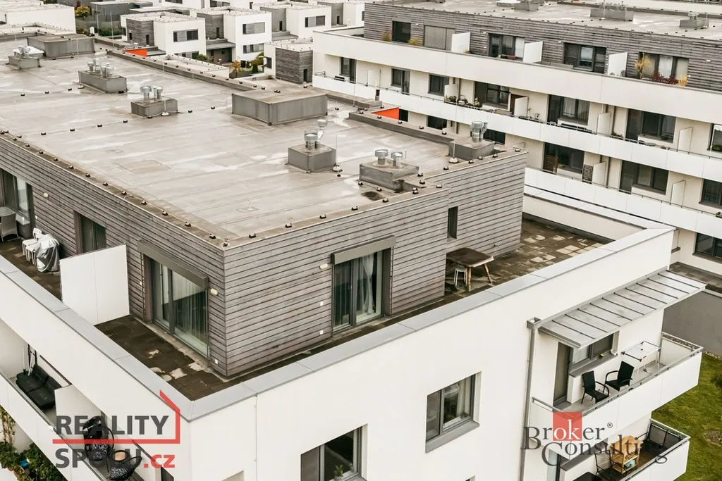 Celý byt obléhá prostorná terasa o velikosti 59 m2, na kterou vede vstup z každého pokoje.