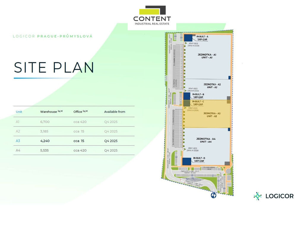 - aktuálně jsou 2 volné, sousedící, propojitelné jednotky 4240 (A3) a 5535 m² (A4)