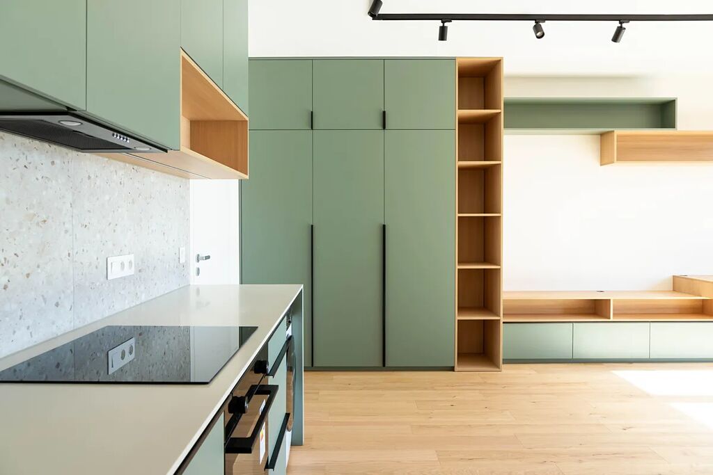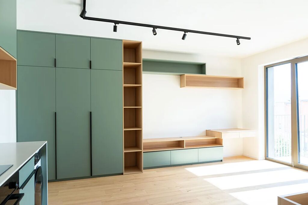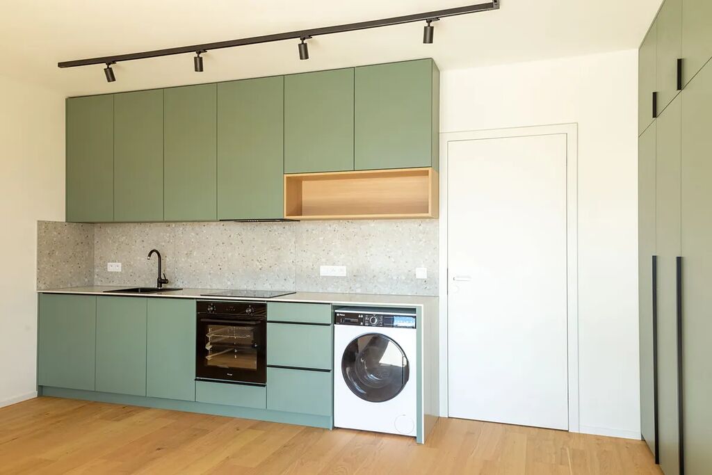 Vybavení bytu: předsíň s praktickými úložnými prostory, kuchyňská linka na míru se spotřebiči (lednice s mrazákem, trouba, varná deska, digestoř, myčka), pračka, postel bez matrace a obývací stěna na míru. Byt bude také dovybaven venkovními black-out žaluziemi.