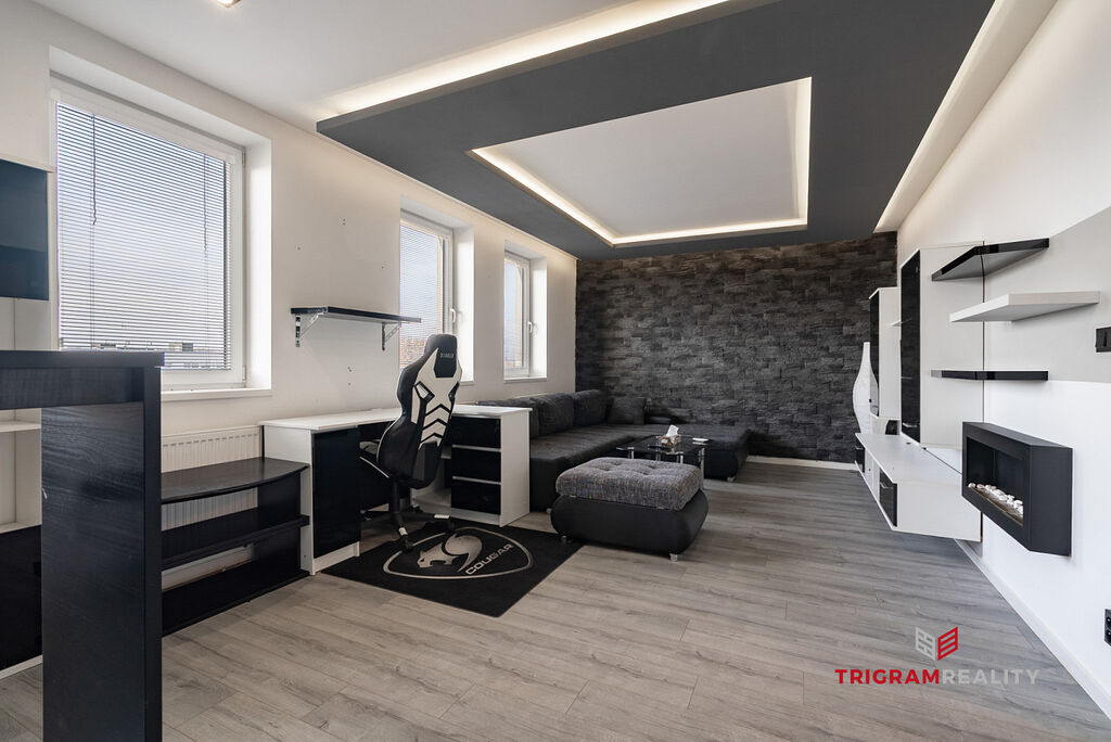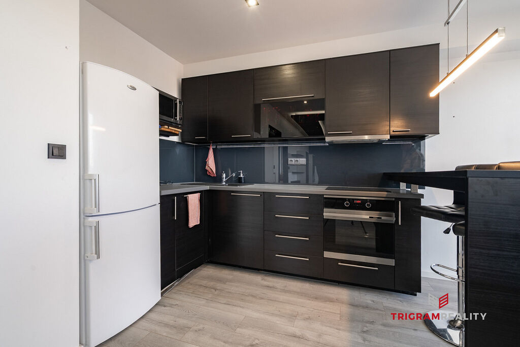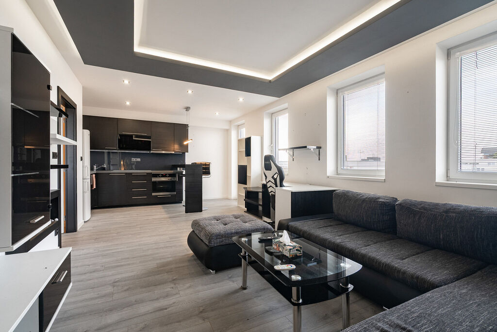 Kuchyně je vybavena lednicí s mrazákem, myčkou, indukční varnou deskou, el. troubou a mikrovlnnou troubou. Prostorný obývací pokoj s velkou sedací soupravou, TV a konferenčním stolkem, plynule navazující na kuchyňský kout. Ložnice je včetně postele a nechybí ani dostatek úložného prostoru. Součástí koupelny je sprchový kout, kombinovaná pračka se sušičkou a WC. Byt má i komoru přímo v dispozici.