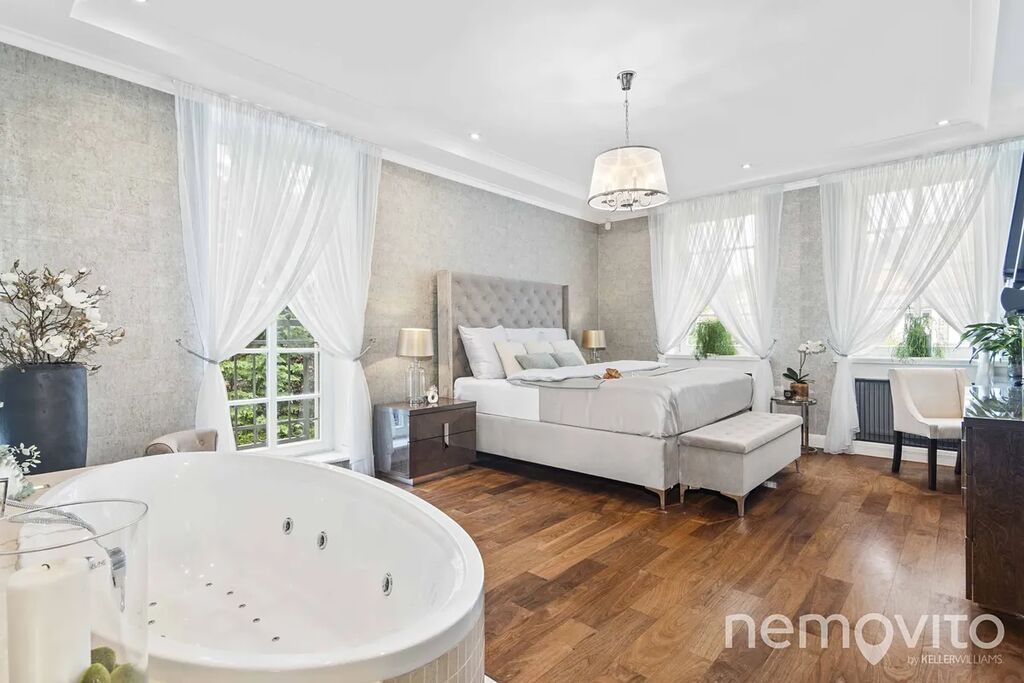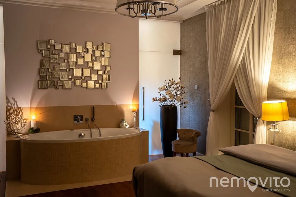 On the first floor there is also a quest room or an office (dressing room, bathroom). The hall is dominated by a beautiful wooden staircase. The master bedroom (24 sqm) with an en-suite bathroom and a free-standing bathtub also has a dressing room. The children's rooms (19 and 25 sqm) are connected by a bathroom and a large dressing room. Above the entire floor plan of the house there is a spacious attic. The current layout offers a 4-bedroom villa with 3 bathrooms.