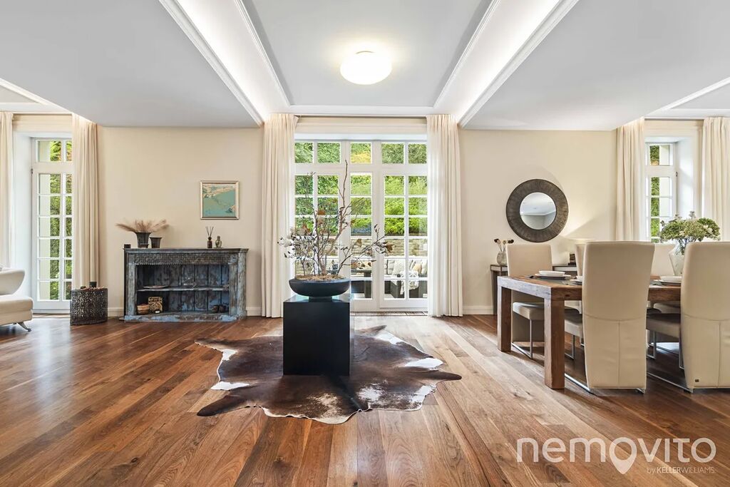 The dominant feature of the house is the living room, whose area is almost 100 sqm in total, with several French windows. These provide amazing views of the green garden, which is designed with maximum privacy. The living room has a fireplace and an entrance to the terrace. Thanks to the terrain difference, it is completely separated from the neighboring street. The space can easily accommodate up to twenty guests.