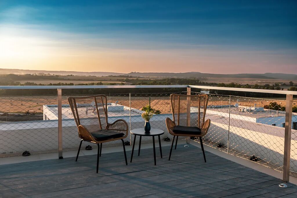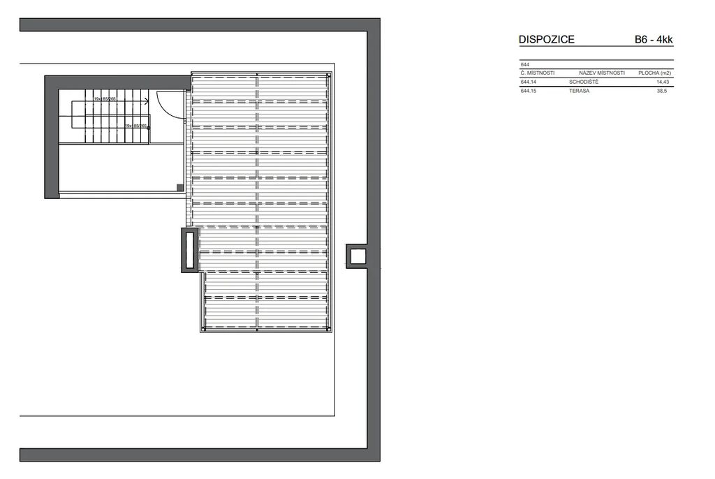 - Soukromá střešní terasa (38,5 m2) se schodištěm přímo z bytu (14,43 m2) – ideální pro relaxaci nebo grilování (pozn.: terasa není dimenzovaná pro vířivku)
