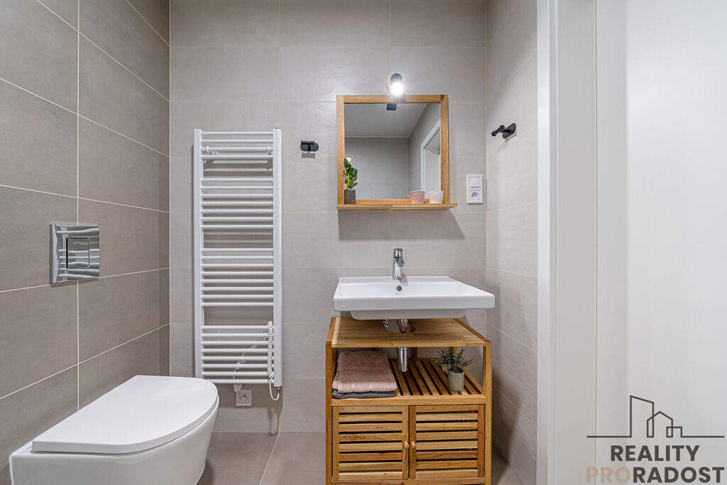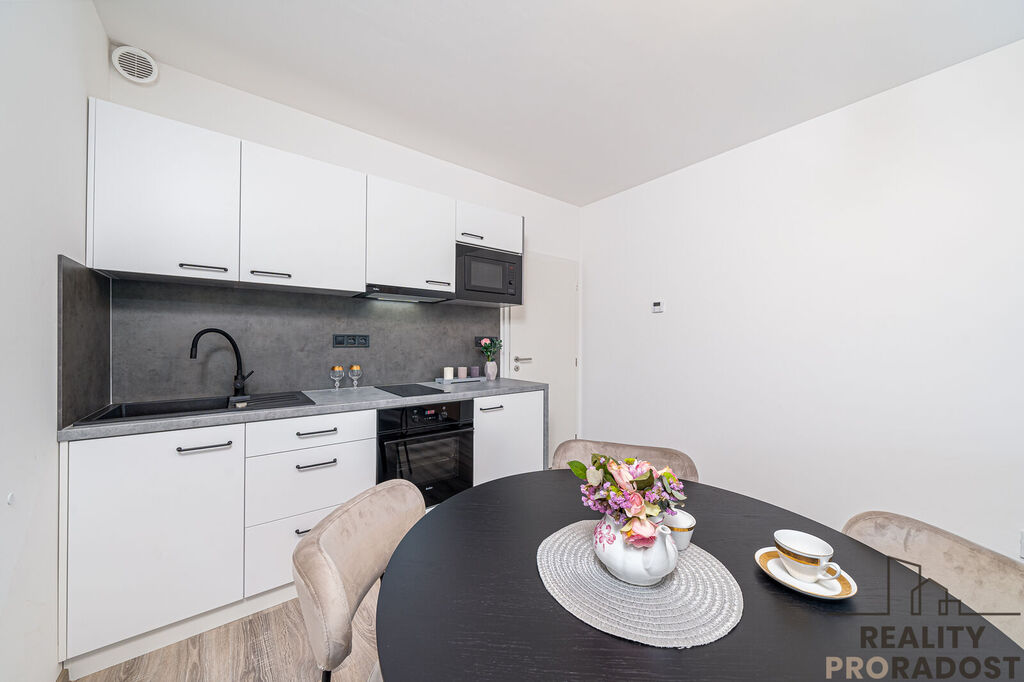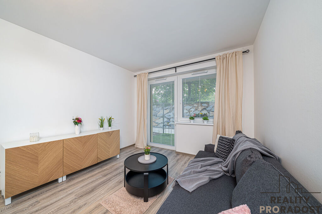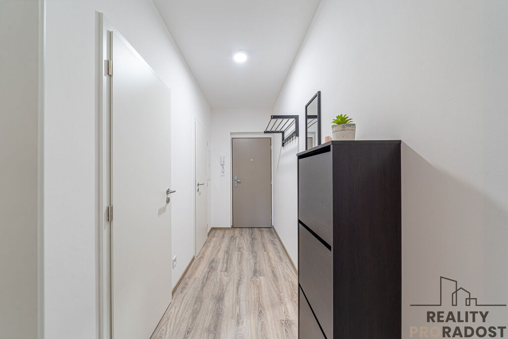 Byt je o dispozici 1+ kk a o výměře 32 m2. V bytě je vstupní chodba, pokoj s kuchyňským koutem, koupelna se sprchovým koutem, umývadlem a WC. Dále je v bytě praktická šatna vybavená vestavěným regálem a sušákem. Kuchyňská linka je s vestavěnými spotřebiči vyrobená na míru. Je zde el. trouba, varná deska, digestoř, mikrovlnka a lednice.