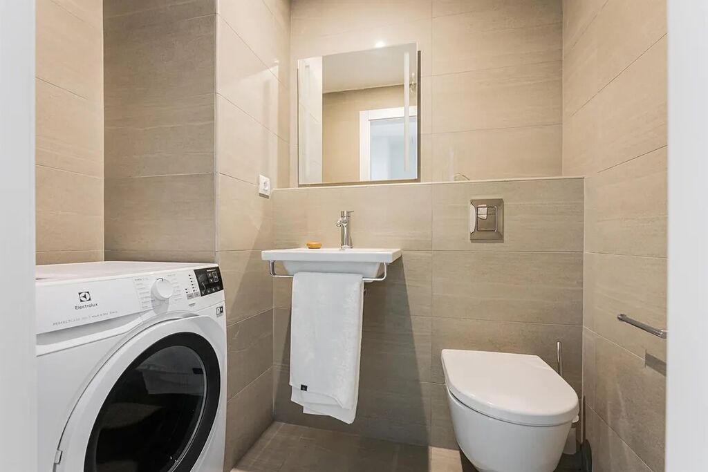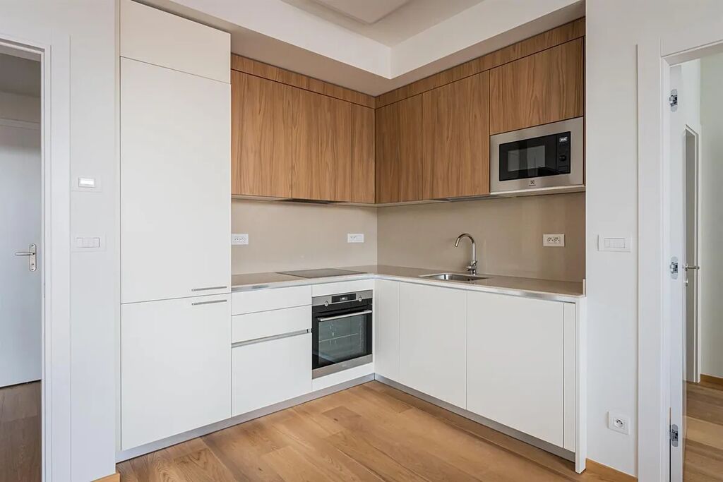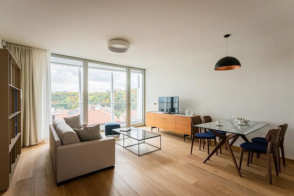 Reprezentativní moderní byt 2+kk (1 ložnice, 1 koupelna), s terasou (10m2) a celkovou obytnou plochou 70,34m2, je situován v 5. patře zcela nového luxusního rezidenčního komplexu s výtahem, recepcí, bazénem, saunou, prostornou zahradou ve dvoře, sklepem a možností parkování v podzemním parkovišti. Byt je vybaven klimatizací.