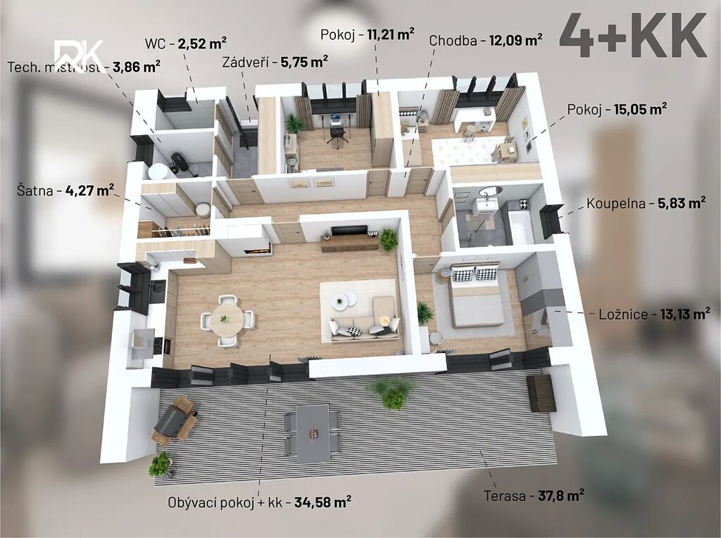 Dispozice 4+kk a podlahová plocha 146,09m² zaručují ideální rozvržení pro rodinný život bez omezení. Nízkopodlažní řešení přináší pohodlí života na jednom patře – bez schodů, s přirozeným propojením vnitřního a venkovního prostoru.