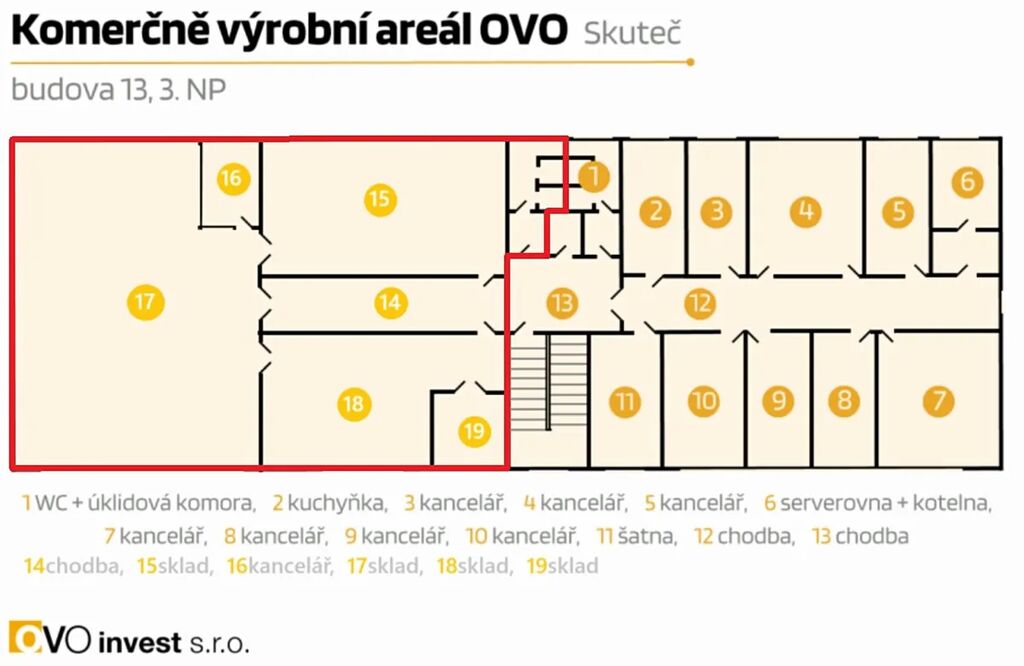 Nabízíme k pronájmu výrobní prostor po celkové rekostrukci o velikosti 360m², který se nachází ve druhém patře budovy č.13 v komerčním areálu na ulici Husova ve Skutči, v blízkosti železničního nádraží. Prostor je přístupný také nákladním výtahem o nosnosti 1000kg. Výrobní prostor je ihned k dispozici. V objektu je možnost pronájmu i dalších výrobních prostor, stejně jako kancelářských či skladů. Areál je kompletně oplocen a napojen na všechny inženýrské sítě. Parkování je možné přímo u budovy. Nájemné činí 36.000,- Kč + DPH, zálohy na energie se hradí zvlášť. Vratná kauce odpovídá výši dvou měsíčních nájmů. Jsme přímí majitelé, neplatíte provizi realitní kanceláři. Pokud hledáte kvalitní výrobní prostor v blízkosti centra města s dobrým zázemím, neváhejte a domluvte si prohlídku.