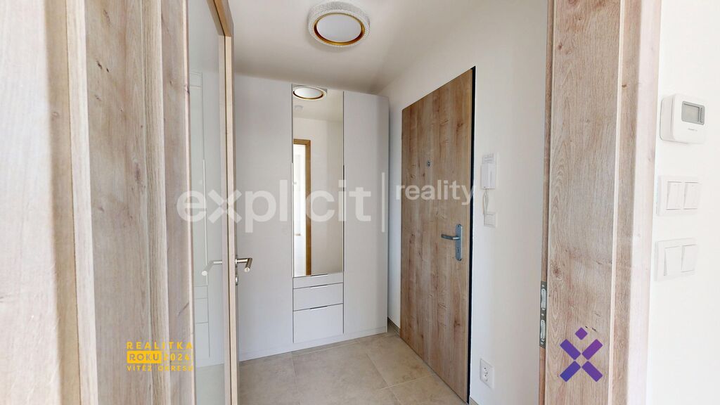 Obytná místnost s kuchyňským koutem je vybavena kuchyňskou linkou s troubou, elektrickou varnou deskou a digestoří. V zádveří se nachází praktická vestavěná šatní skříň. Koupelna disponuje sprchovým koutem, toaletou a přípravou na připojení pračky a sušičky.