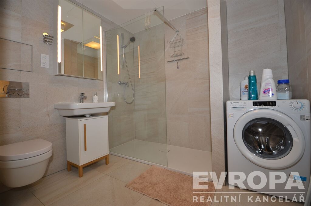 Pokud hledáte bydlení nedaleko centra Prahy, tak právě Vám nabízíme moderní a světlý byt dispozice 2+kk, plocha 53m2, s balkonem 3,5m2 a vlastním garážovým stáním v suterénu domu. Byt se nachází ve 4 podlaží novostavby, Rezidenční projekt Smíchov City, od společnosti Sekyra Group. Skládá se ze vstupní předsíně (chodby), která propojuje všechny místnosti v bytě, hlavní a největší místností je obývací pokoj s kuchyňským koutem (23,8m2), dále samostatná ložnice (14,3m2), koupelna s vanou, wc a pračkou. Z obývacího pokoje je výstup na příjemný balkon s orientací na západní stranu do klidného vnitrobloku domu. Velkoformátová okna jsou vybavená venkovními automatickými roletami. Kuchyňská linka je vybavena sklokeramickou indukční varnou deskou, troubou, myčkou a lednicí s mrazákem. Vytápění bytu je řešeno ústředním vytápěním, s automatickou regulací a v bytě je rovněž rekuperace. Byt se nachází ve vyhledávané lokalitě, která nabízí absolutní dostupnost mhd, metro, tramvaje, autobusy, vlaky jsou v přímém sousedství, dále nadstandardní občanskou vybavenost včetně restaurací a kaváren přímo v rezidenci. O bezpečí rezidentů se vedle přístupového a kamerového systému stará také centrální recepce, stejně jako o agendu spojenou se stále více potřebným přebíráním zásilek. Cely blok rezidence působí jako tradiční činžovní domy, můžete si tedy zvolit, jestli vstoupíte přímo do svého domu, nebo projdete přes centrální recepci bytové části situované z ulice Šiklova a dále přes zahradu. Vedle recepce je situován i kontrolovaný vjezd do společných podzemních garáží. Majitel preferuje nájemce bez domácích zvířat a ideálně max. dvě pracující osoby (pár). Byt se nabízí k pronájmu kompletně zařízený viz. fotografie a je k nastěhování volný ihned.