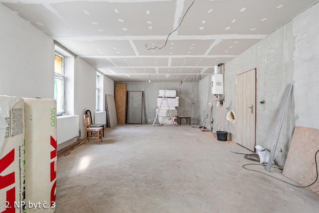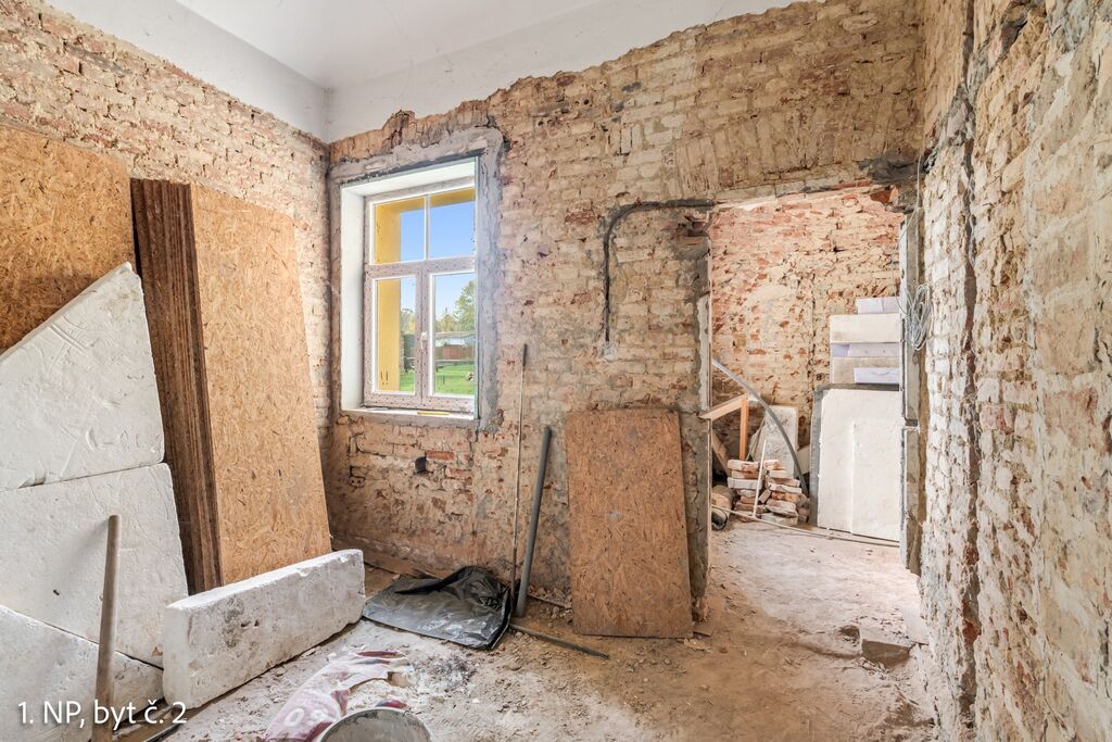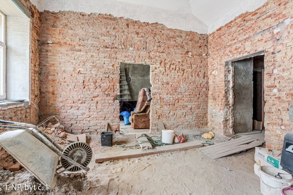 V 1. patře jsou byty zhruba z 50 % hotové, s dokončenými rozvody a částí stavebních úprav.