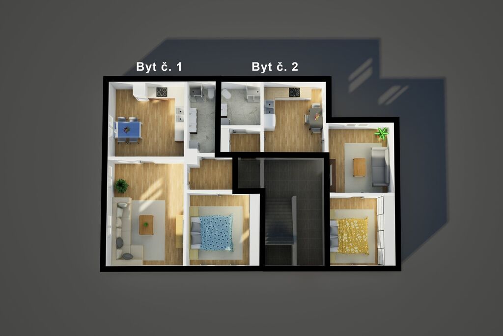 • Byt 2 (43 m²): dva pokoje, samostatná kuchyň a koupelna.