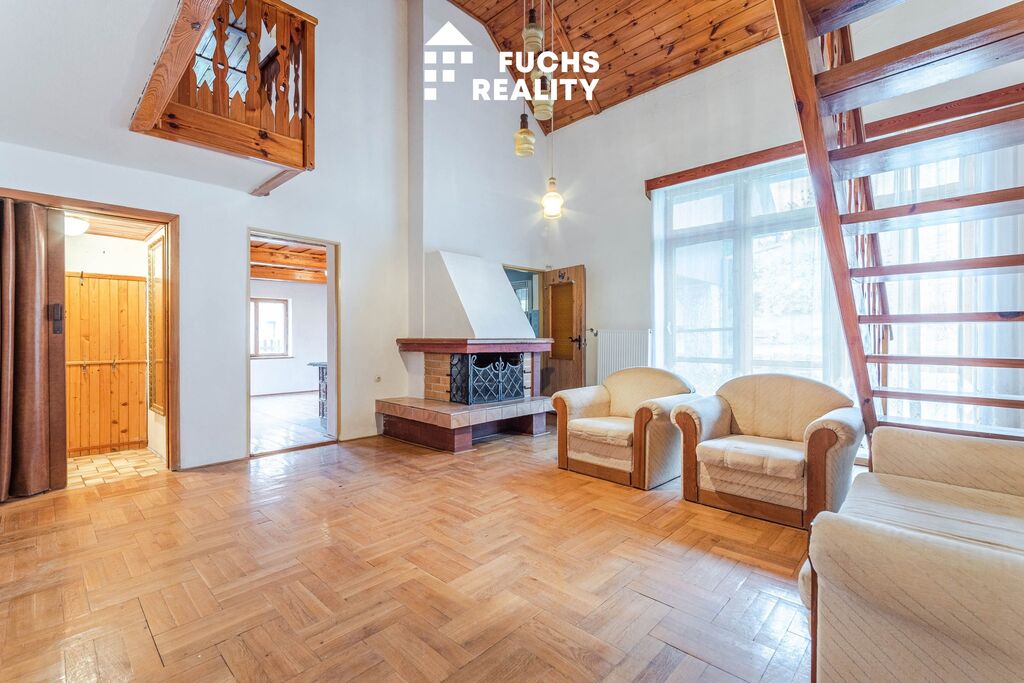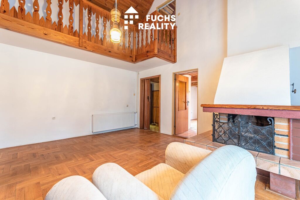 Přízemí domu vás přivítá útulným obývacím pokojem s krbem, který propojuje patro otevřeným prostorem a vytváří tak příjemnou vzdušnost. Dále zde najdete plně vybavenou kuchyni, pokoj vhodný například jako pracovna či ložnice pro hosty, koupelnu a technické zázemí – kotelnu a garáž, kterou majitelé využívají jako sklad paliva.
