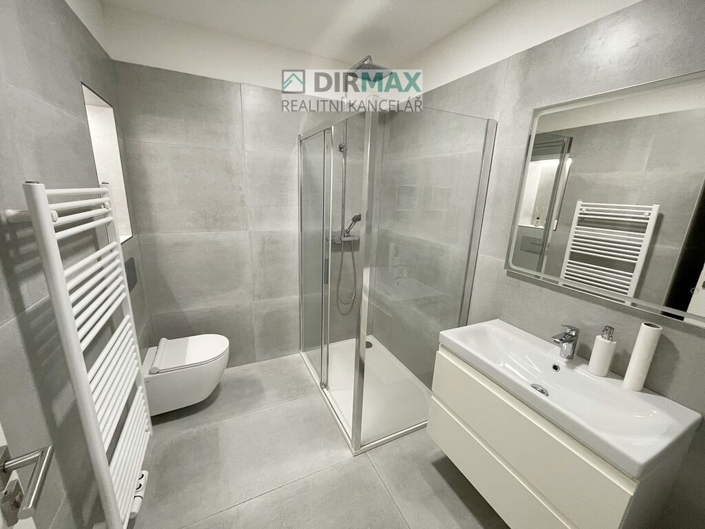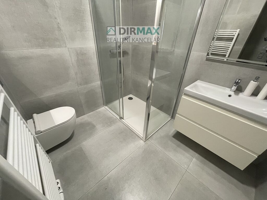 Jádro bytu je zděné, kde v koupelně je příprava na pračku a sušičku, závěsné WC, topný žebřík, prostorný, skleněný sprchový kout, umyvadlo se spodními skříňkami a zrcadlo s osvětlením.