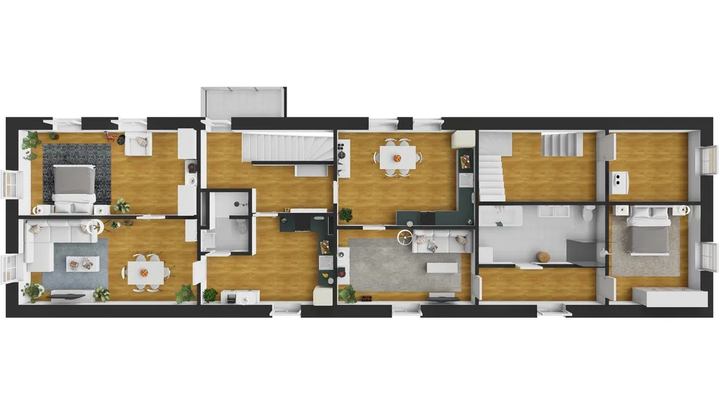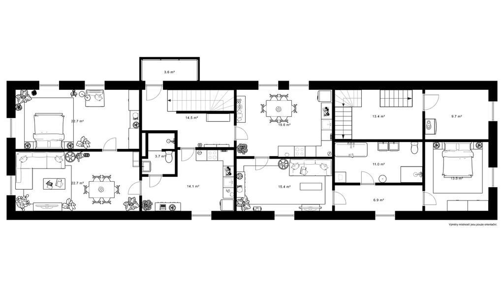 V patře se nacházejí dvě bytové jednotky typu 2+1 po částečné rekonstrukci. Mají hotové nové rozvody, ale čekají na finální osazení kuchyňské linky a sanitárního vybavení.