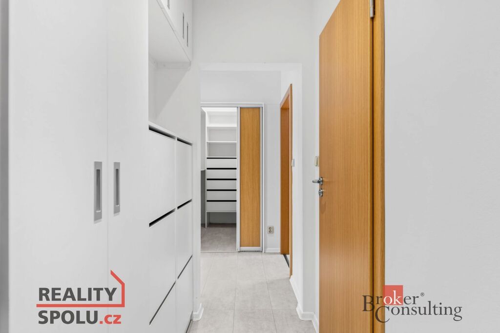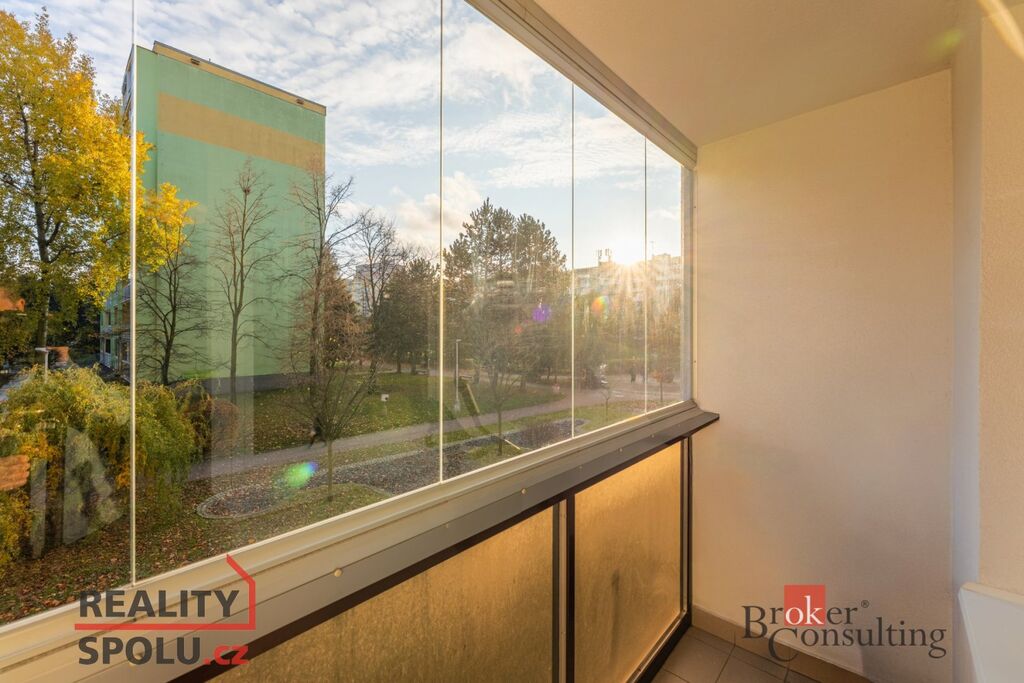Dispozici tvoří chodba, samostatné WC, koupelna s vanou a podlahovým vytápěním, prostorná šatna, ložnice, obývací pokoj, kuchyně a zasklený balkon s otevíratelnými panely. Sklep není k dispozici, k bytu je však možnost umístit 1 kolo do společné kolárny. Topení i teplá voda jsou centrální. V kuchyni je kompletní kuchyňská linka včetně spotřebičů: varná deska, trouba, mikrovlnná trouba, myčka a lednice (samostatná). Součástí vybavení je také pračka. V ložnici se nachází rám manželské postele včetně roštů a dvě komody, v obývacím pokoji obýváková stěna. Podlahy: parkety (ložnice, obývací pokoj), vinyl (chodba, kuchyně), dlažba (koupelna, WC).
