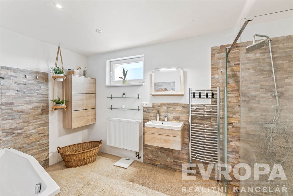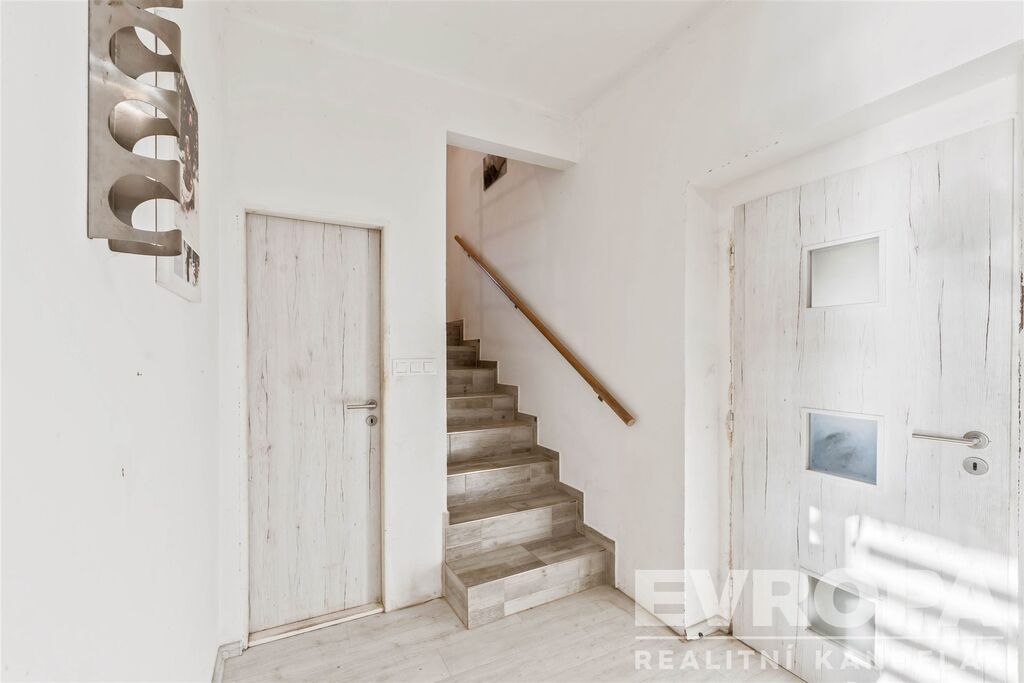 V patře jsou dva pokoje, ložnice (16,17 m2) a dětský pokoj (17 m2) a chodba (13,14 m2) a malá šatnička.