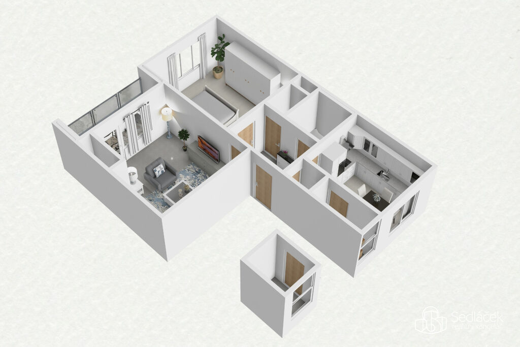 Součástí inzerce jsou i vizualizace interiéru, které slouží jako inspirace pro možnou podobu bytu po rekonstrukci.