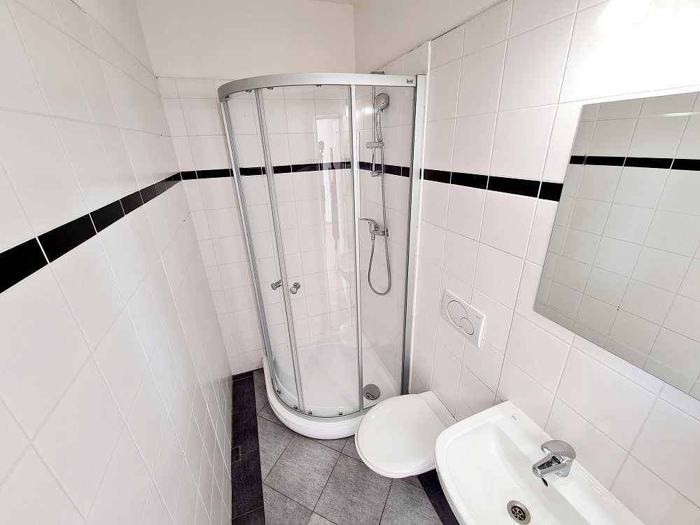 Dispozice: pokoj s kuchyňským koutem 32 m², koupelna se sprchovým koutem společná s WC 2 m². Na patře se nachází prádelna, která je k dispozici výhradně nájemníkům (využití za úplatu).