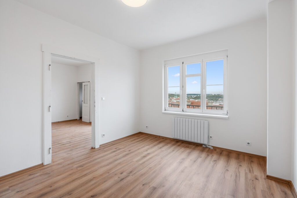 Z balkonu se nabízí úchvatný panoramatický výhled na celou Prahu, který je jedinečným bonusem této nemovitosti.