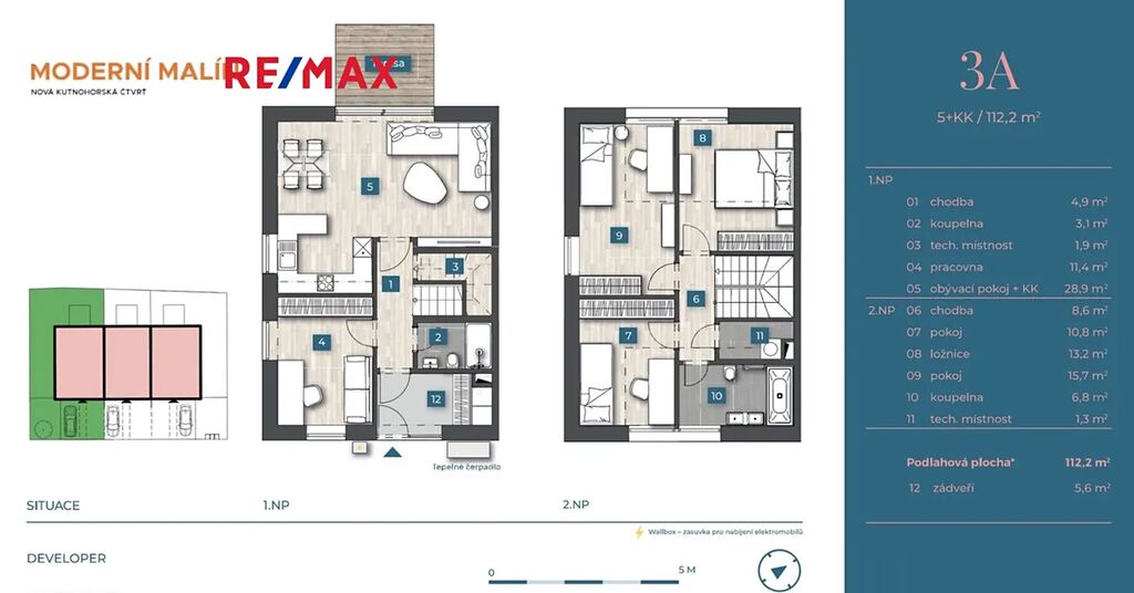 Každý dům nabízí do detailu promyšlenou dispozici 5+kk - 4 samostatné pokoje, obývací pokoj s kuchyňským koutem, 2 koupelny a technickou místnost. Venku posedíte na terase či na zahradě a před domem zaparkujete dva své vozy.