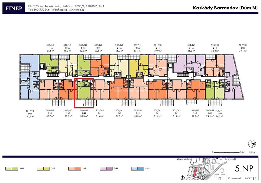 Bytová jednotka 1+kk o velikosti 33,3 m2 + balkon 6,0 m2 se nachází v 5. nadzemním podlaží (z celkových šesti) s orientací na východ.
