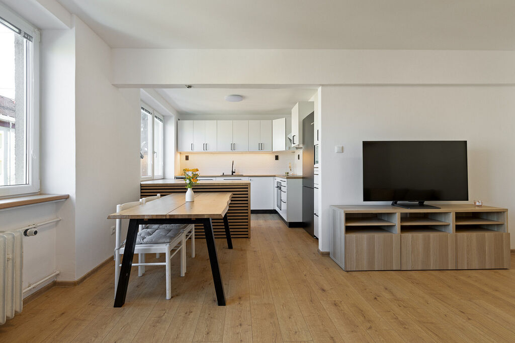- vybourání příček a propojení kuchyně s obývacím pokojem,
