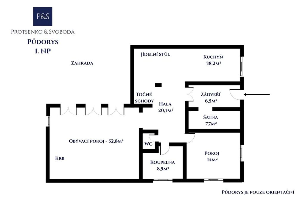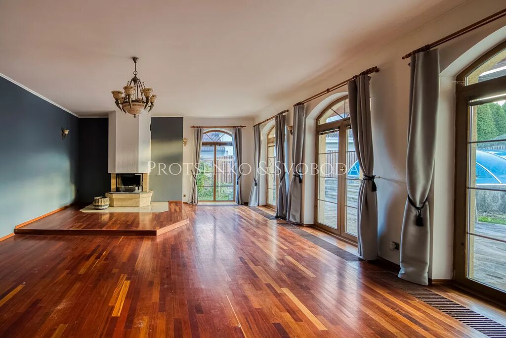 • Velkorysý obývací pokoj (~50 m²) s krbem a francouzskými okny do zahrady