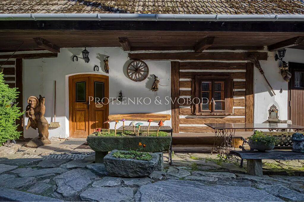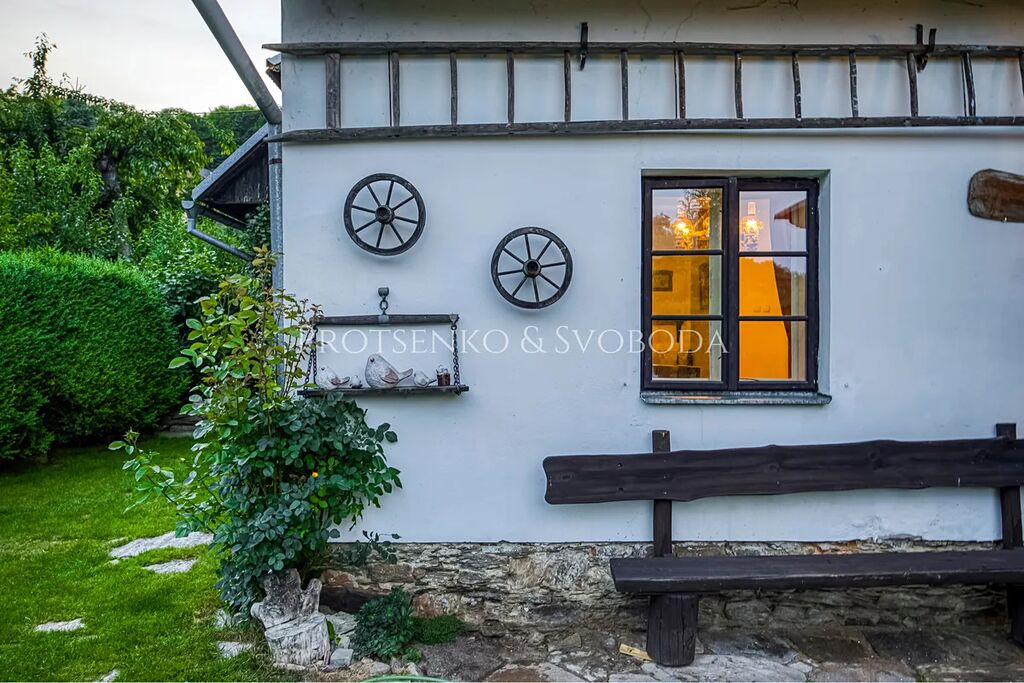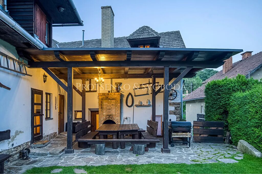 Dominantou domu je velká společenská místnost v tradičním roubeném stylu s kachlovými kamny a výčepem – srdce domova, kde se schází rodina i přátelé. K domu náleží pečlivě udržovaná zahrada s grilem, krbem a krytým venkovním posezením. Děti potěší trampolína, pískoviště i bazén, dospělí zase naleznou klid v šumu stromů a vůni lesa.
