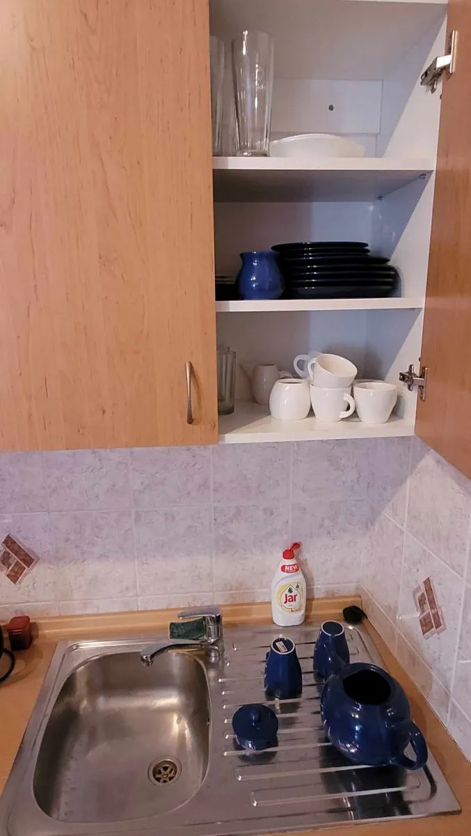 Od kuchyňské linky s vybavením, jídelny, posezení s TV, postel, skříně, pračka viz. foto.