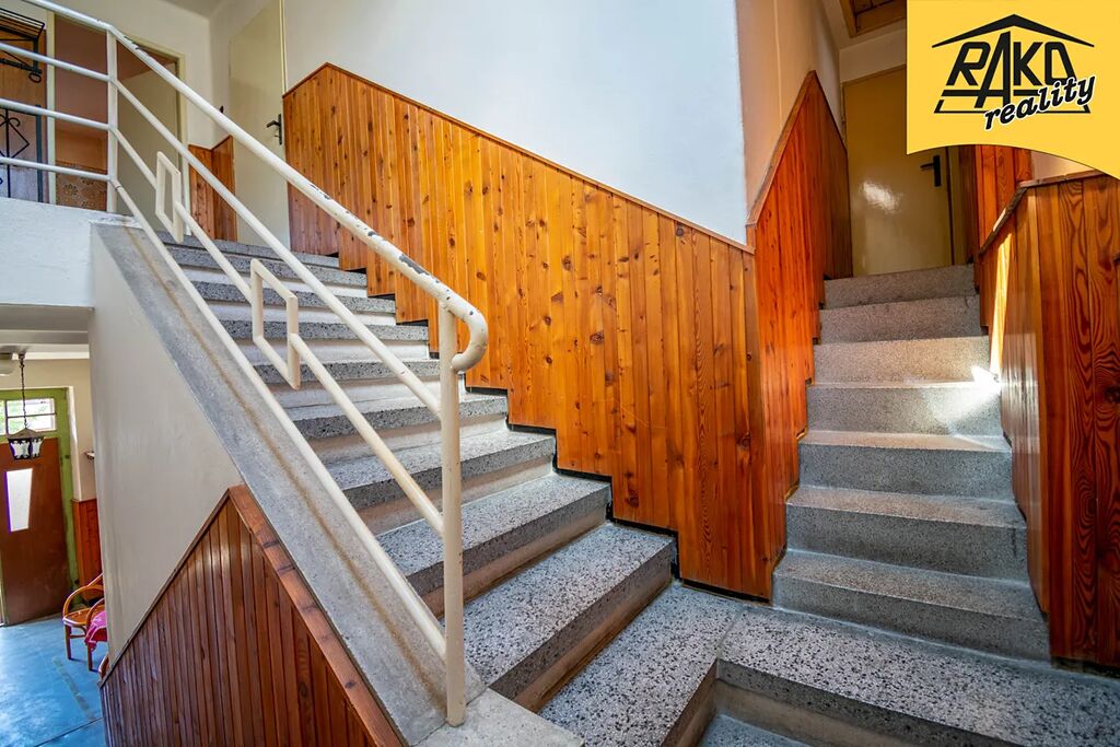Z centrální chodby vede schodiště do mezipatra, kde je umístěna obytná místnost (15,9m2), koupelna (9 m2), šikmina/úložný prostor (8,5m2) a WC (0,84 m2).