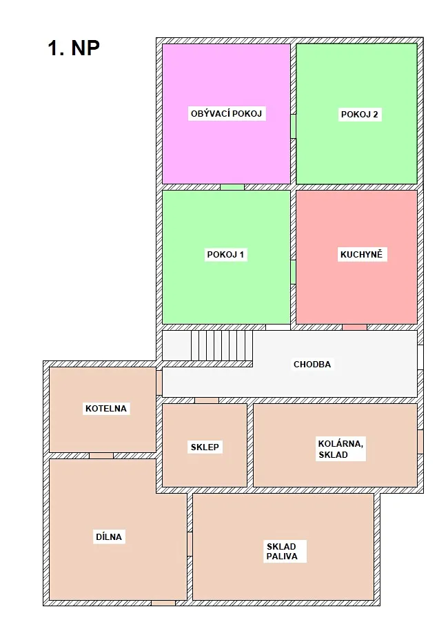 V 1. NP vede středem centrální chodba (12 m2), kdy je po pravé straně umístěná obytná část a po levé straně technická část. Obytná část disponuje kuchyní (17,3m2), z kuchyně je vstup do další místnosti (18,4m2) a následně dalších dvou pokojů ( 19,3 m2 a 18,3 m2). V levé části je menší sklípek (7,8m2), prostor pod schody, prádelna (12 m2), dále kotelna s dílnou (26, 5m2), následuje sklad paliv (19 m2).